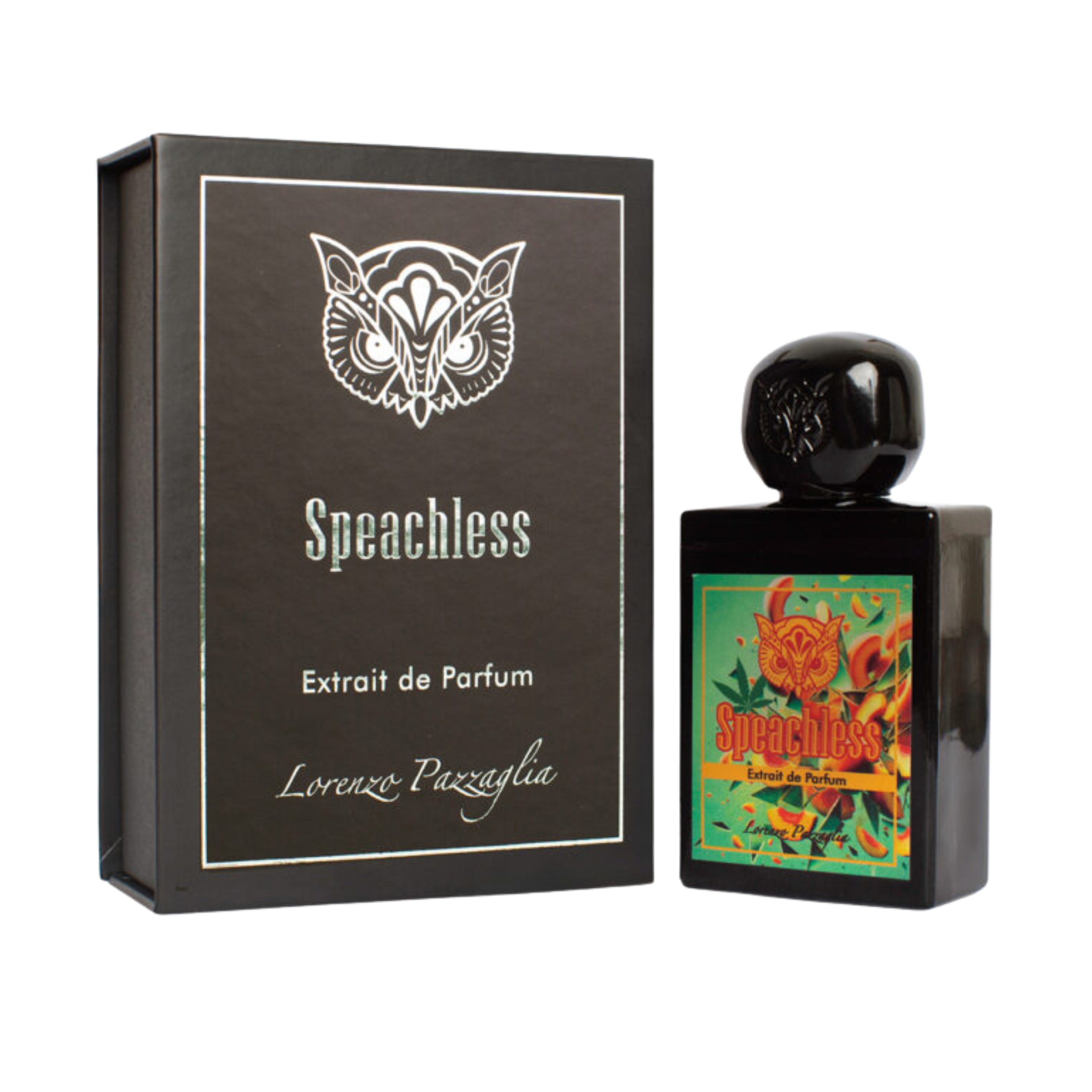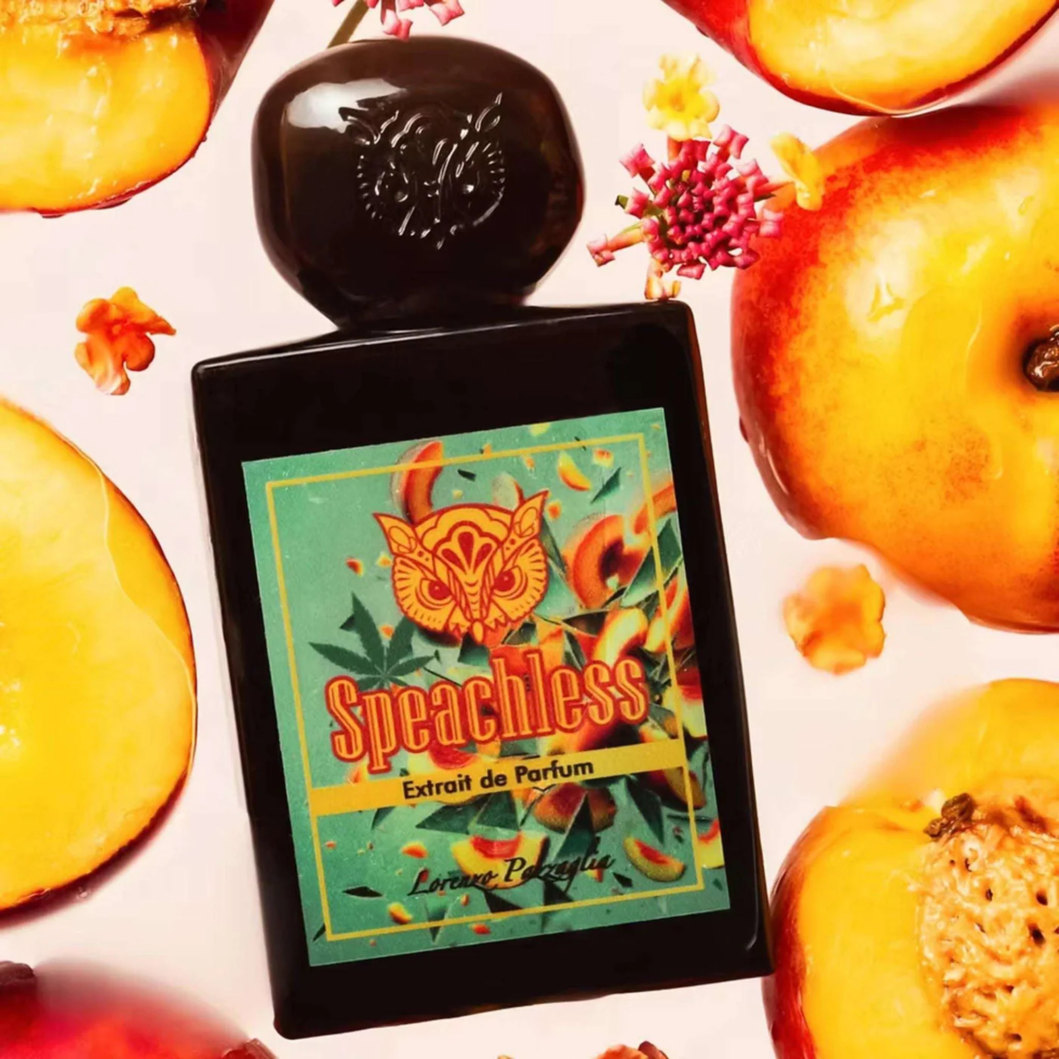 Lorenzo Pazzaglia Speachless es una fragancia unisex audaz, fresca y vibrante. Se abre con una explosión de cítricos (limón, lima, bergamota) y frutas jugosas como el durazno y la manzana verde. En su corazón fluyen flores como jazmín, magnolia, violetas, junto con matices herbales, y finalmente descansa sobre una base de vainilla, sándalo, vetiver, almizcle blanco y un toque de cannabis para añadir carácter.